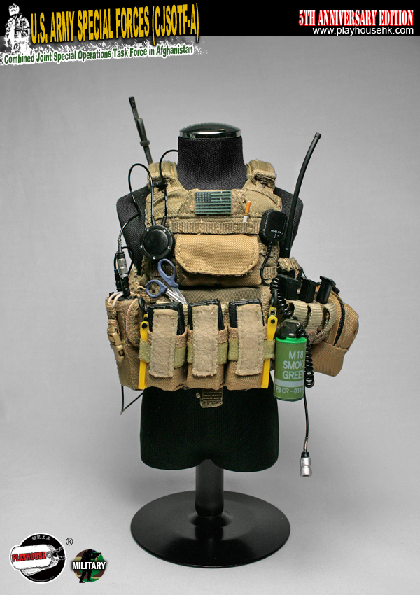 Playhouse 5th Anniversary Edition - U.S. Army Special Forces (CJSOTF-A) parts list: tru-type combat shirts (cb+wl), tru-type bdu pants (wl), special forces releasable body armor vest (rbav-sf)(cb), mlcs single fragmention grenade pouch (ct), mlcs triple m4 magazine pouch (ct), mlcs utility pouch (ct), mlcs signal pouch (ct), mlcs admin pouch (ct), ai mbitr radio pouch (ct), tt modular dump pouch (cb), 6038c triple 9mm magazine pouch (ct), sof-individual first aid kit (ifak) pouch (cb), drop-leg padded thigh plate (cb), m.a.s.t. antenna holder (cb), retention lanyard (tan), multi-tool sheath (blk), thermobak omega hydration pack (acu), sob combat master knife sheath (blk), sob combat suspender (blk), shemaghs (blk+white), rigger belt (blk), dieter cqd sling (blk), underpants (white), bungee hook (od) x 2, duct tape (od), velcro (blk)
