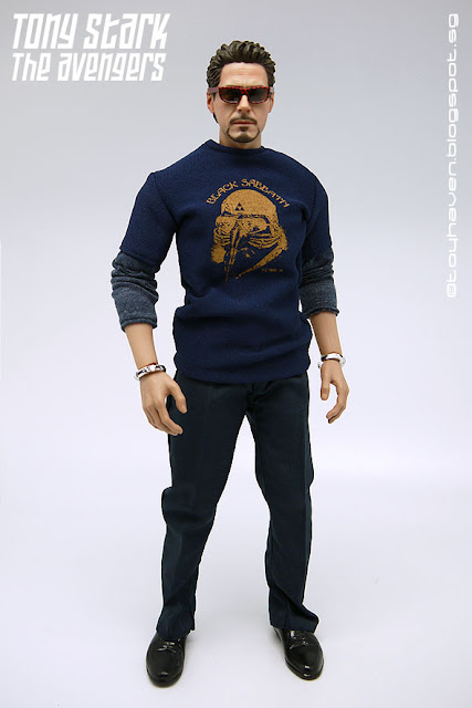 In the 2012 "The Avengers" movie, when not in his armor suit, Robert Downey Jr. as Tony Stark was seen dressed in his very distinctive civilian attire of Black Sabbath T-shirt over a long sleeve tee and dark colored pants. Scroll down to see pictures of this Asmus Toys "Avengers' Stark" 1/6 scale action figure clothing series set put on a 12-inch Tony Stark figure.