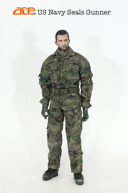 ACE 1/6 scale US Navy SEAL Gunner 12-inch military figure will come with 100% hand-made realistic weathering and consists of 12-inch Man Mk I body, Bare hands, Gloved hands, Bonnie hat, Net scarf, Woodland BDU - jacket, pants and belts, Tee, UDT life jacket, Knee pads, Tropical boots, Riverine gunner load bearing assault vest 1195K, 0990A assault pack, Triple pistol magazine pouch, MPK combat knife, 3-day assault backpack, SAS holster, P226 pistol, 9 mm pistol magazine x 2, M43 Mod 0 machine gun, Ammo box, 7.62mm ammo belt, Gunner sling.