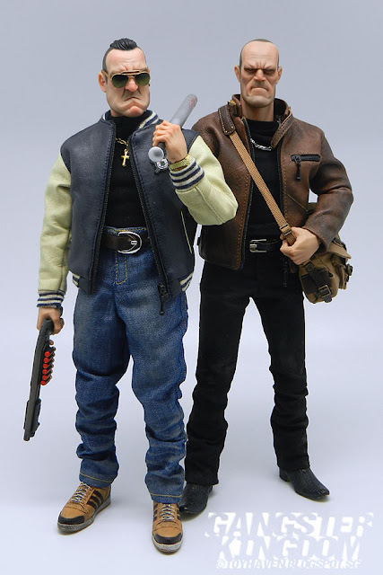 Here are pictures of DAM Toys Gangsters Kingdom 1/6 scale Spade J (stylized Jason Statham) and Spade 2 (animated Vinnie Jones) 12-inch figures standing side-by-side. Spade J (Jack of Spades, real name Ogier, Nelson's step brother) and Spade 2 (Nelson, dealing in drugs and guns in Rio) were released by DAM Toys under their new Gangsters Kingdom line but both bear a lot of resemblance to real life actors Jason Statham and Vinnie Jones respectively, even though they are rendered in a very caricature-like manner. The sculptured hands also match the head sculpts and they look really good (quality is top notch too!). Best part of it all is: they are value-for-money i.e. NOT expensive and easily affordable which is great when there are so many figures to choose from nowadays :)