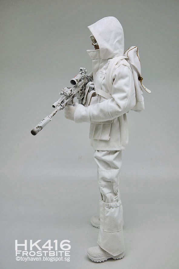 Having gotten the MC Toys F-029 1/6 scale Snow Space set for 12-inch figures and kitting it out with the Nobody Toys "Dreamcatcher" 1:6 scale head sculpt of Leonardo DiCaprio HERE (head sculpt first reviewed HERE) for the Inception movie snow scene, I realized that Dom Cobb (Leonardo DiCaprio) was missing the winterized Blaser R93 LRS2 Precision Sniper Rifle with suppressor in Fischer's Winter Fortress dream. Since I don't have a 1:6 scale winterized Blaser R93 LRS2 Precision Sniper Rifle with suppressor in my possession, this E&S (Easy & Simple) 1/6 scale Assault Rifle 416 Special Forces set E (Frostbite) - reviewed in the previous post HERE - will have to do for now.