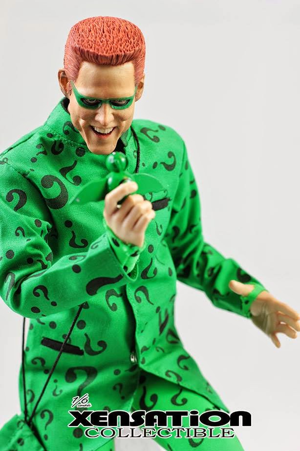 Xensation Collectibles 1/6 scale Mister ? 12-inch figure Features: 12-inch Figure with 1/6 scale head sculpt that bears a likeness to Jim Carrey as The Riddler from "Batman Forever", Bodysuit, Jacket, Shoes, Hat, Bag with Grenades x 2, Staff, Hand Assortment, Figure Stand.