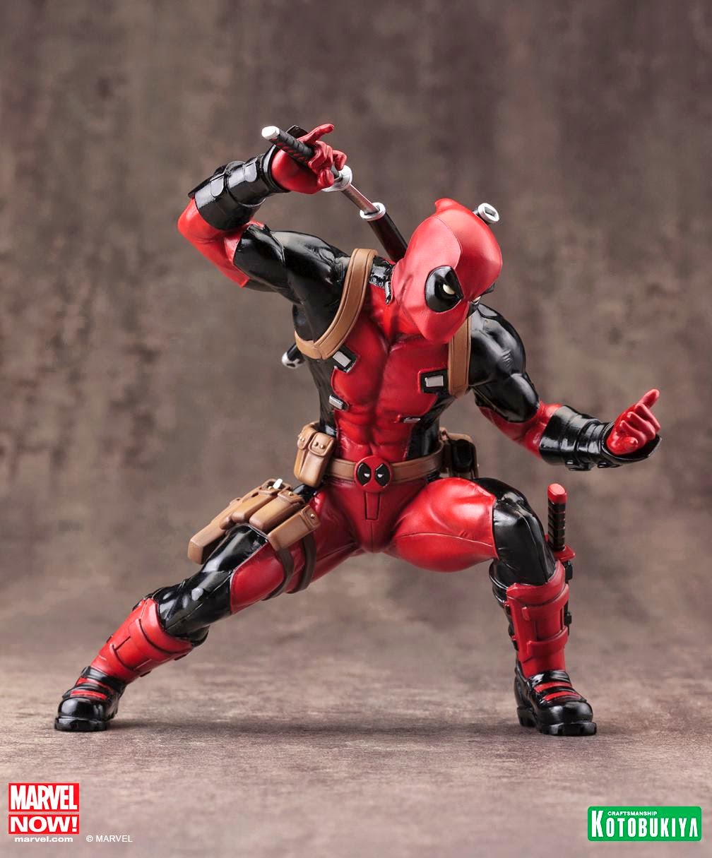 These are preview pictures of Kotobukiya's Marvel Now Deadpool ARTFX+ Statue. It does look pretty awesome and might prove to be a hot seller given the character's rise in popularity these days. Why that is I'm not too sure but he does get a lot of attention and is proving to be as hot as Wolverine.