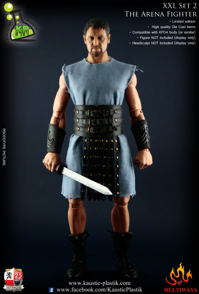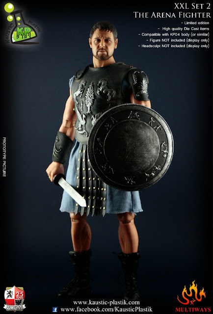 Kaustic Plastik XXL Set 2 – 1/6 scale Arena Fighter Outfit Set (Limited Edition) Features: Tunic, Breastplate Armor, Left Shoulder Armor, Wrist Gauntlets, Sword, Shield, Leather Footwear, Balteus and Cingulum. NOTE: Generation K Muscular Figure with Head Sculpt not included (sold separately - see pictures at the bottom of this toy blog post)