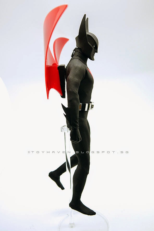 Here's the DC Direct Batman Beyond 1:6 Scale Deluxe Collector figure with glider wings attached and deployed. The wings are translucent which makes it look futuristic. The whole ensemble with predominantly black with some dash of red does make the figure look intimidating and cool at the same time. The mask (it's no longer a Bat cowl) makes all the difference between this Batman and all the other Batman that came before. The mask covers the entire face and yet all the features such as eyes, nose and lips are still prominent and can be seen.