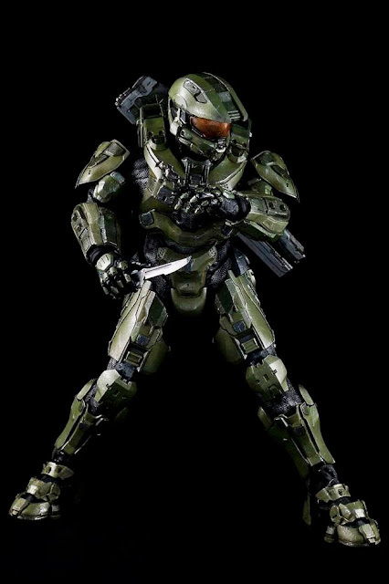 ThreeA Toys HALO 4 Master Chief Spartan Mark IV Sixth Scale Figure stands 13.5 inches (34.3cm) tall with Over 35 points of articulation featuring fully articulated fingers. MA5D Assault Rifle & ARC-920 Railgun magnetically attach to shoulder armor, Illuminated Helmet featuring LED lights on both sides with Highly detailed sculpt and paint application. Weapons: ARC-920 Railgun, MA5D Assault Rifle, M11 Combat Knife. Batteries required: AG1 x 3 for the Illuminated Helmet feature (not included)