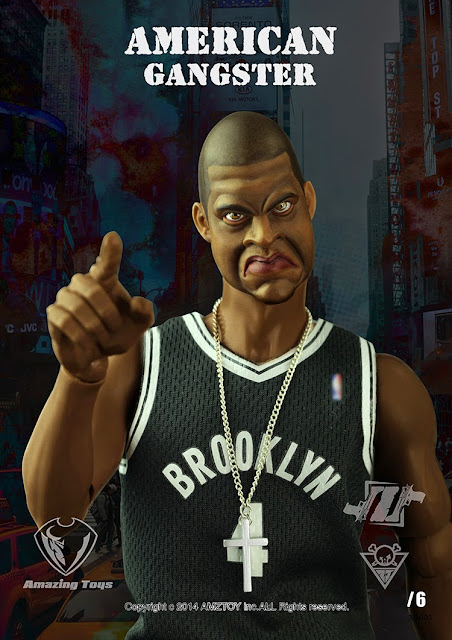 AMZ Toys No. AG001 1/6 scale American gangster the first chapter: The king of brooklyn AKA "Z" will come with 1/6 scale head sculpt, 12-inch figure body, Baseball cap, Basketball vests, Jacket, Black cowboy pants, Blue jeans, belt, black T-shirt, wave shoes, Necklace x 2, Sunglasses, Silver DE x 2 (Desert Eagle), Microphone, interchangeable hands x 6