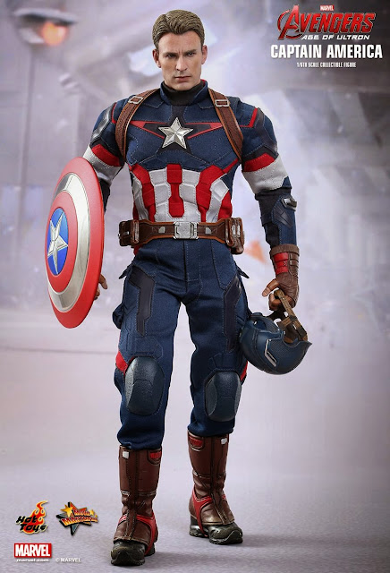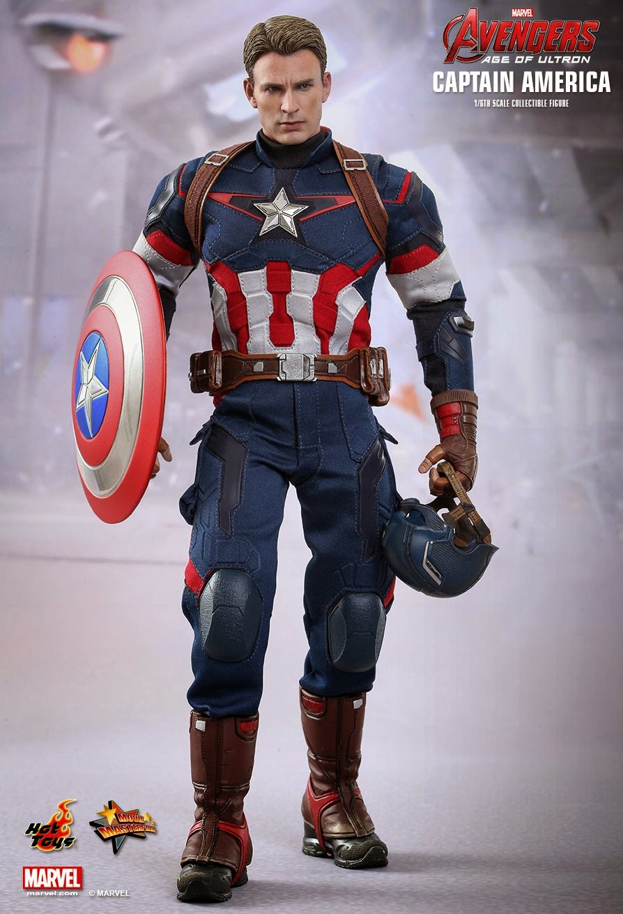 Hot Toys Movie Masterpiece Series MMS281 "Avengers: Age of Ultron" 1/6th scale Captain America Collectible Figure specially features: Authentic and detailed likeness of Chris Evans as Captain America in Avengers: Age of Ultron with Newly painted helmeted head sculpt, Newly painted unhelmeted head sculpt, Movie-accurate facial expression with detailed wrinkles and skin texture (Each piece of head sculpt is specially hand-painted), Approximately 31 cm tall Body with over 30 points of articulations, Magnets embedded in figure’s forearms and back for holding shield, Eight (8) pieces of interchangeable gloved palms including: One (1) pair of relaxed palms, One (1) pair of fists, One (1) pair of shield holding palms with magnets, One (1) shield throwing right palm, One (1) shield catching left palm