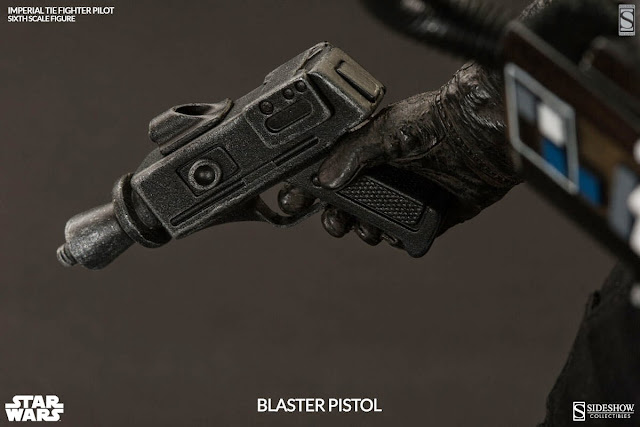 The Imperial TIE Fighter Pilot Sixth Scale Figure features: Fully Articulated Body, Highly Detailed Flight Helmet, Gas Transfer Hoses, Life Support Pack, Torso Armor, Vacuum G-Suit, Positive Gravity Pressure Boots, Detailed Blastech R-11 Rifle, Rifle Holster, Belt, Six (6) Interchangeable Hands Including: One (1) Pair of Fists, One (1) Pair of Neutral Hands, One (1) Left C-Grip, One (1) Right Trigger Hand, Figure Support Base. Sideshow Exclusive: 'Retro' Pistol Blaster