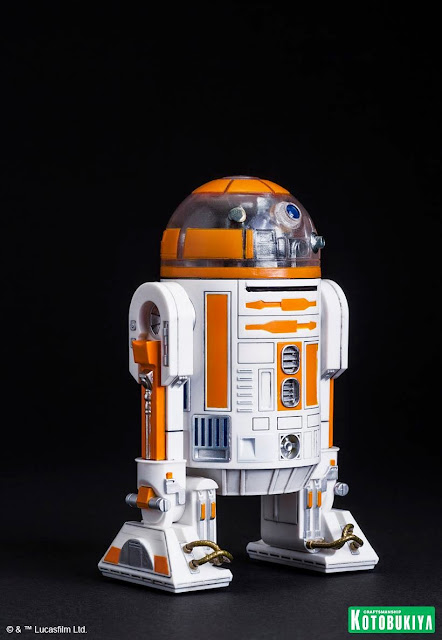 R3-A2 stands nearly 4 inches tall in 1/10th scale, includes alternate pieces allowing for display standing upright on two legs or inclined on all three, and comes with a special collector’s coin featuring the logo of Industrial Automation, the manufacturers of Astromech Droids.