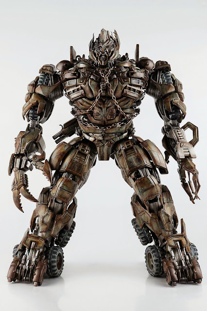 ThreeA Transformers 18-inch (47cm) Tall Megatron Premium Scale Collectible Figure features: Fully Possible With Over 70 Points of Articulation, Including Articulated Fingers, Highly-Detailed Sculpt and Paint Application, Featuring Realistic Weathering Effect, Metal Chains Wrapped Around Torso, Brute Shotgun Weapon Included. LED Light-Up Feature on Eyes. Requires AG1 x 3 button cell batteries (not included)