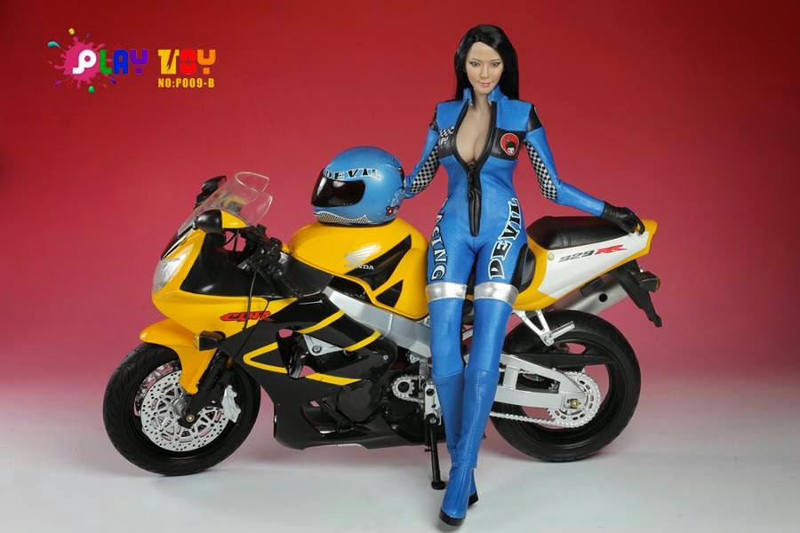 1/6th scale girls wearing motorcycle racing suits are not new. There have been quite a number of these biker babes released in the past. Most recently there was the Play Toy 1/6 scale Bride Killer version 2.0 Female Action Figure Collectible Set previewed HERE and sometime back there was the Triad Toys 1/6 scale Gunn 4 Hire: Catalina 12-inch female biker action figure which definitely needed the helmet to stay on LOL (check out my toy blog post HERE). Back in 2009, I had reviewed the ZC World 12-inch Rosanna Bike Girl which came with a 1/6 scale motorcycle all at a very affordable price. You can see the pictures of the bike HERE, Rosanna Biker Chick HERE and gal on bike HERE.