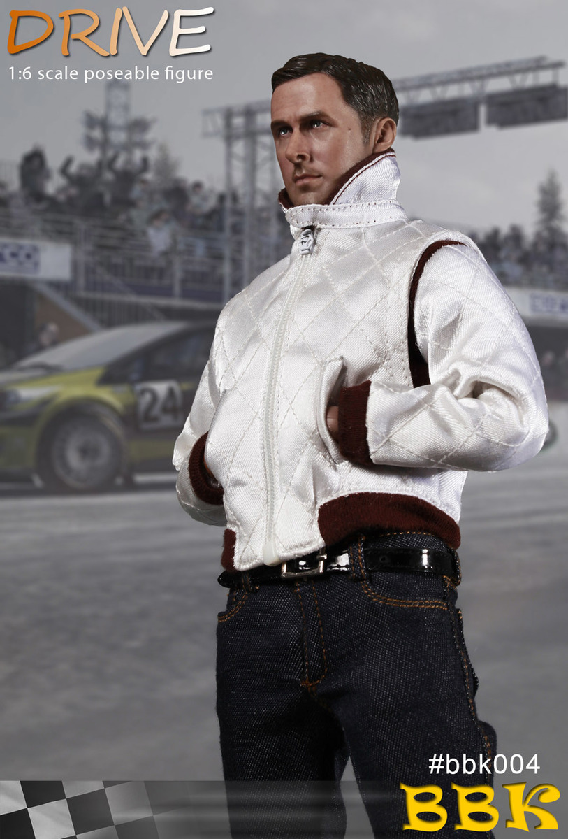 BBK BBK004 1/6th scale Drive 12-inch action figure will come with head sculpt, 12-inch figure body, gloved hands, Tee, Racing Jacket, Denim Jacket, Jeans, Belt, brown shoes, hammer, cap, sunglasses, cell phone, watch