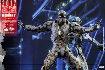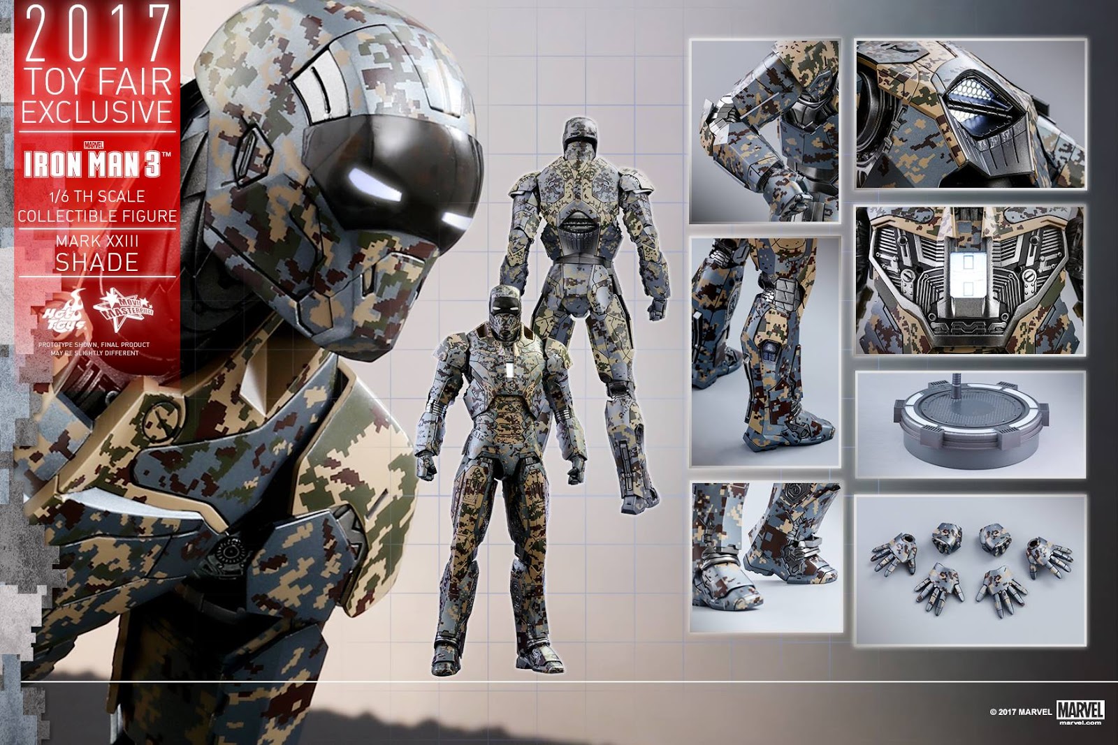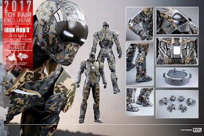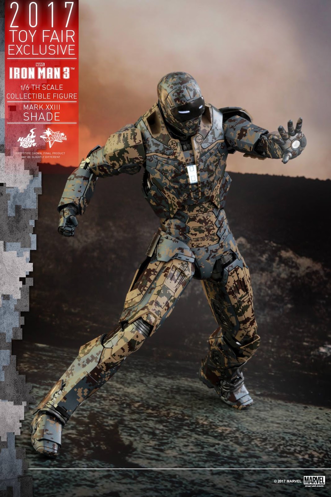 Hot Toys Toy Fair Exclusive MMS415 Iron Man 3 1/6th scale Shades (Mark XXIII) Collectible Figure’s special features: Authentic and detailed likeness of Shades (Mark XXIII), the Extreme Heat Suit, in Iron Man 3 | Over 30 points of articulations | Approximately 31 cm tall | Special features on armor: Specially applied metallic color painting with digital camouflage pattern, LED-lighted eyes and rectangular-shaped RT on chest (white light, battery operated), One (1) removable chest armor, Three (3) pairs of interchangeable hands including: One (1) pair of hands with movable fingers and light-up repulsors (white light, battery operated), One (1) pair of fists, One (1) pair of repulsor palms (white light, battery operated) | Articulations on waist armor which allow flexible movement
