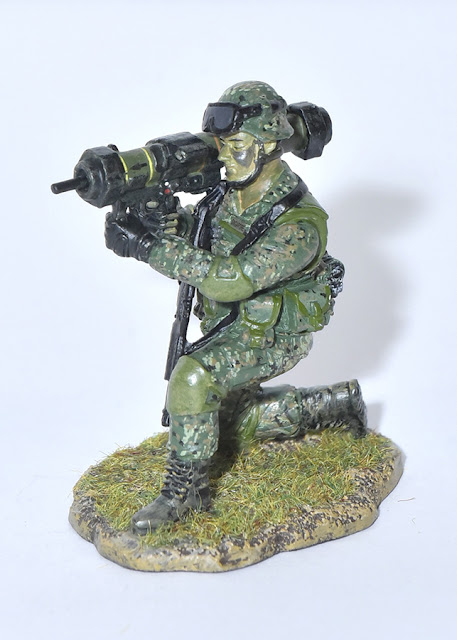 MATADOR GUNNER - Adopting a firing position, another third-generation soldier has a Matador anti-armour weapon system perched on his shoulders as he prepares to shoot an enemy vehicle. In full camouflage get-up, he also has a SAR 21 rifle slung across his shoulders and wears a load-bearing vest with ammunition pouches.