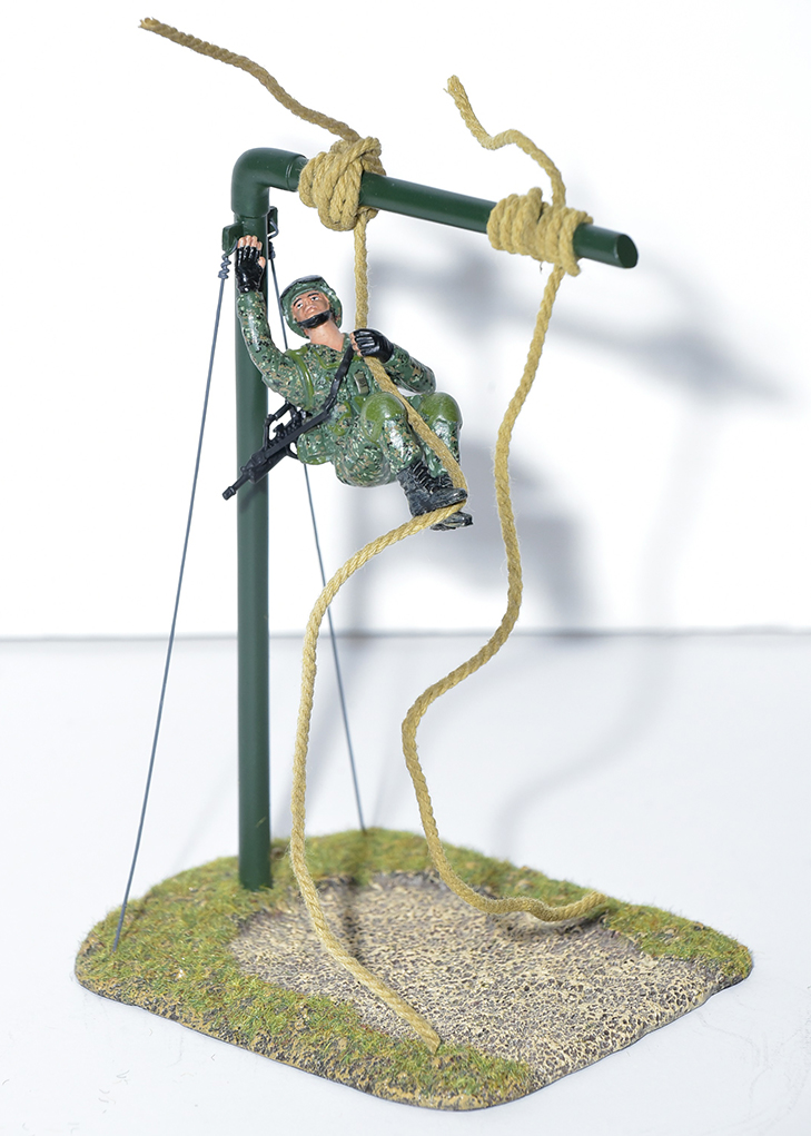 SOC LOW ROPE - A third-generation soldier is on the verge of conquering the low-rope station in the Standard Obstacle Course. To hoist himself up, he needs to use his right leg to loop the rope over his left leg and pull upwards until he taps on the metal bar. He is also carrying a SAR 21 rifle and wearing a load-bearing vest with ammunition pouches.