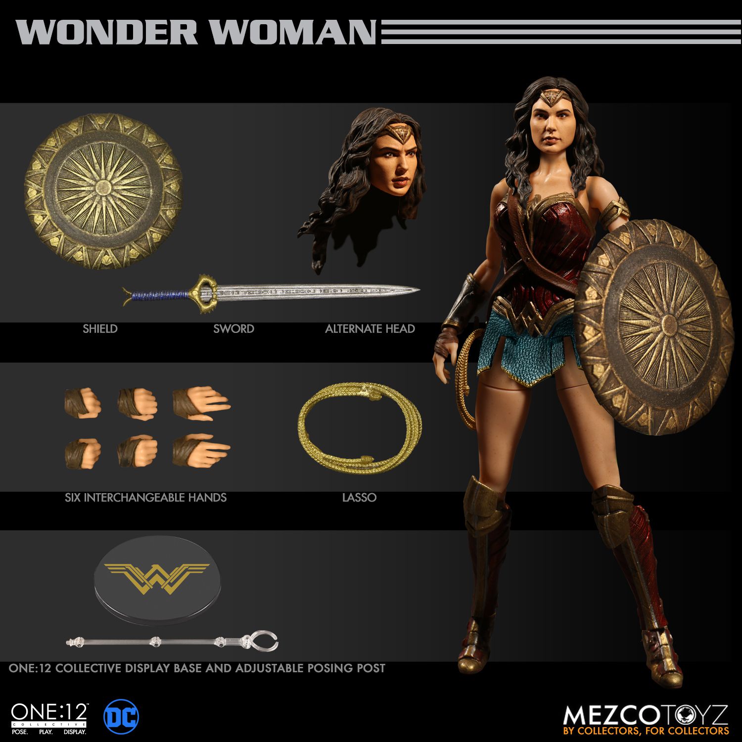 Accessories: shield with arm straps and detailed embellishment, sword with intricately detailed blade, golden Lasso Of Truth, One:12 Collective display base with logo, One:12 Collective adjustable display post