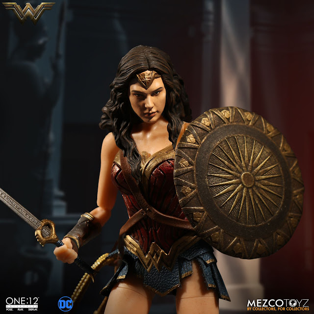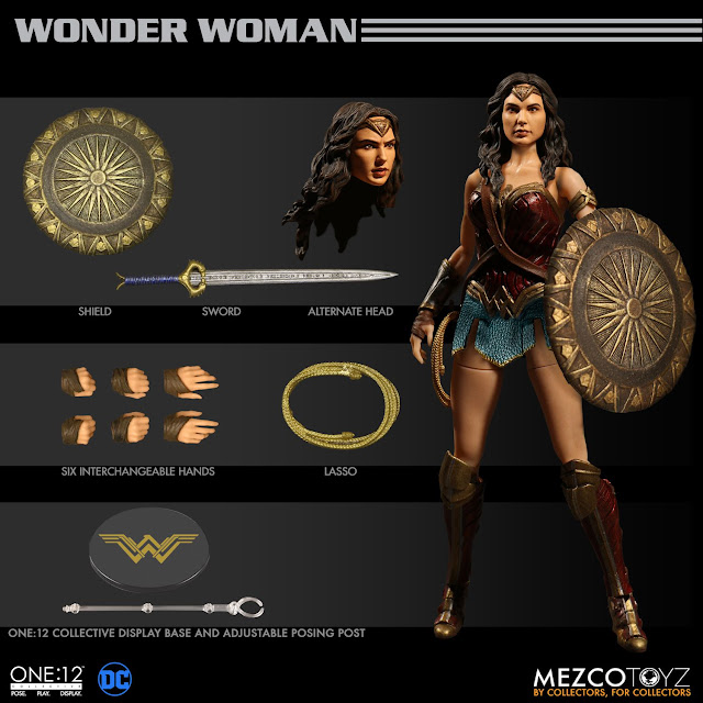 Wonder Woman joins the One:12 collective with a comprehensively detailed outfit and unique character specific accessories. Mezco Toyz One:12 Collective 1/12th scale Wonder Woman Exclusive Figure features: Two (2) newly developed head portraits, Over 16cm tall One:12 Collective body with over 30 points of articulation, Hand painted authentic detailing, Six (6) interchangeable hands including: pair of fists (L & R), pair of posing hands (L & R), sword and shield holding hand (R), lasso holding hand (L)