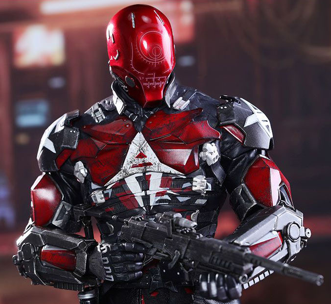 Hot Toys VGM28 1/6th scale Arkham Knight 32cm tall collectible figure special features: Authentic and detailed likeness of Arkham Knight in Batman: Arkham Knight game | blue colored Arkham Knight helmet with LED light-up eyes (white light, battery operated) | interchangeable red colored Red Hood helmet | Approximately 32cm tall Body with over 30 points of articulations | Nine (9) pieces of interchangeable gloved hands including: pair of fists, pair of relaxed hands, pair of hands for holding guns, pair of gripping hands, gesturing right hand