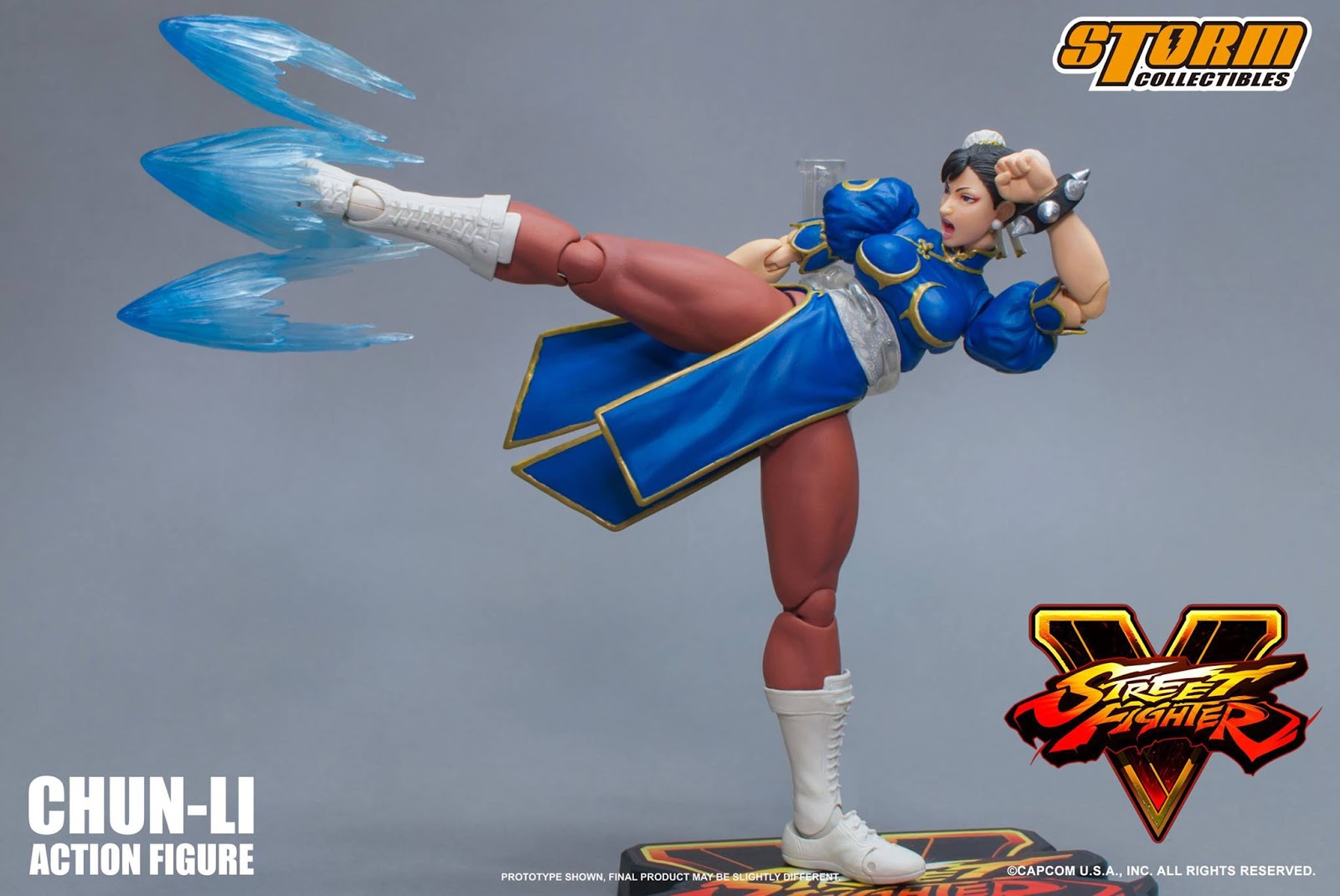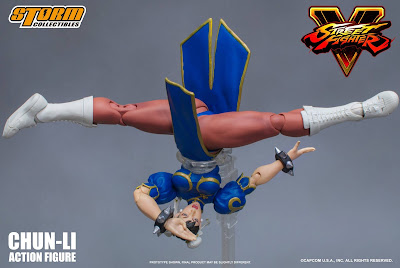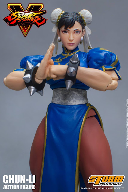 Storm Collectibles 1:12 scale Street Fighter V Chun-Li Action Figure figure set includes: 3 x Interchangeable Head Sculpts 9 x Interchangeable Palm, 1 x Kikoken Effect 1 x Hyakuretsukyaku Effect, 2 x V-Trigger Effect - Renkiko, 1 x Stand with Street Fighter V Logo