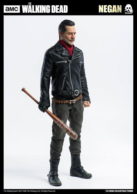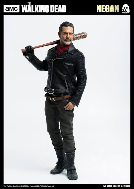 ThreeZero 1/6th scale The Walking Dead Negan collectible details: 12-inch (30.5cm) tall articulated figure featuring tailored clothing; Head sculpt with realistic likeness to the character portrayed in the series; Faux-leather Jacket; Bandana; Long sleeve T-shirt; Pants with Belt; Larger Belt; Boots; Bandage (on left wrist).