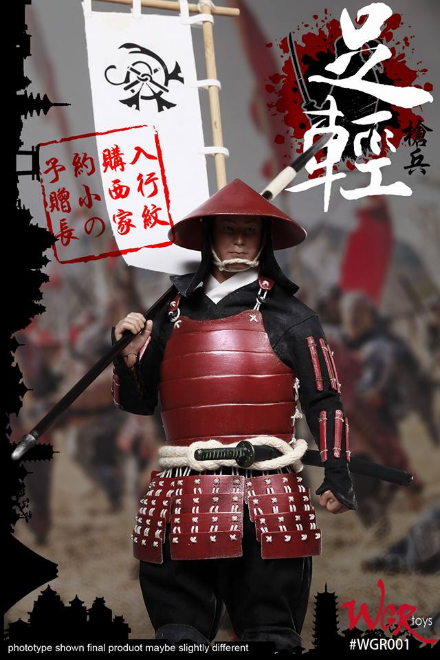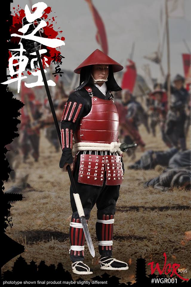 WGRtoys WGR001 1/6th scale Japan Warring States Series The Sengoku period “Ashigaru (足軽, "light [of] foot") Yari” i.e. foot-soldiers employed by the samurai class of feudal Japan armed with the Yari or long spear features: Head sculpt, Hands x 3 pairs, 12-inch figure body, Underwear, Coat, Trousers, Hat, Armor, belt, gauntlet, leggings, socks, straw sandals, knife, pike, flags: sanada banner, konishi banner