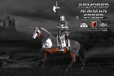 COOMODEL NO.SE014 1/6th scale Series of Empires Medieval Armored Norman Steed specially features: brown sculpt horse, horse head chain armor, horse back chain armor, silver horse helmet, silver horse neck armor, silver horse chest armor, white cloth, suit of leather saddle and harness