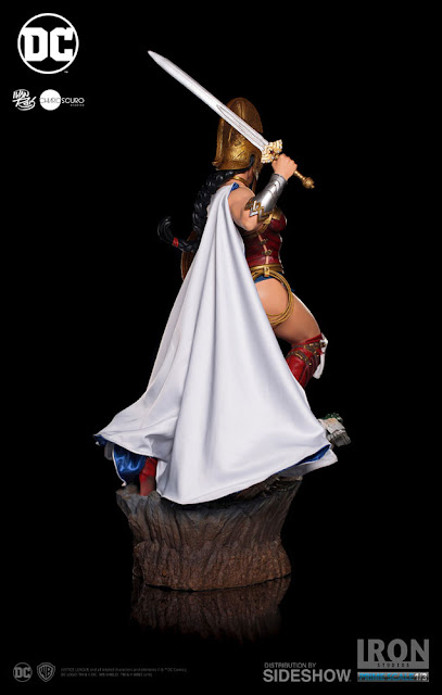 Iron Studios 1:3 scale Wonder Woman 33.5-inch Tall Prime Scale Statue special features: Based on concept art by Ivan Reis from Chiaroscuro Studios | Made in polystone | Hand painted | Cloth cape | LED light up base | Two (2) interchangeable heads | Two (2) left hands and two (2) right hand options can be displayed holding the Lasso of Truth or Shield and Sword | Lasso can be attached to her belt