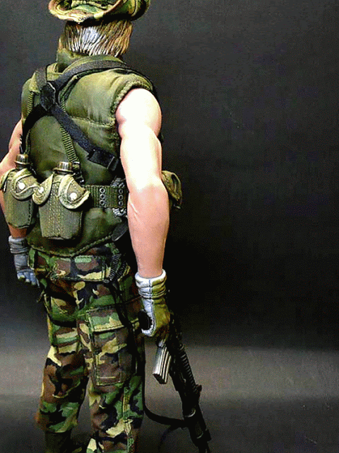 Billy has a "cut" (painted) on his left cheek. His eyes are always looking up as if scanning the trees for the unseen intruder. He carries his combat knife close by his side, taped to his webbing.