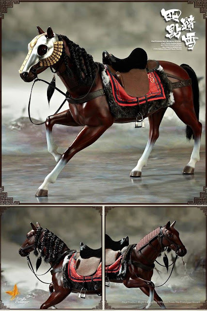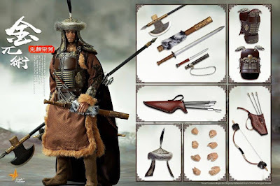 Toys Power Jinwuzhu 1/6th scale Wanyanzongbi 12-inch Deluxe Figure Set Features: golden back cut mountain axe, metal long sword, newly developed head sculpt with artificial hair and floral braid, body approximately 32 cm tall, Four (4) pair of hands, figure stand, felt helmet, shirt, round neck robe, trousers, boots, cloak, belt, suit of leather armor, shoulder armor, waist armor, dagger, bow, Eight (8) arrows, bow set, quiver, snow hoof fire dragon horse, cortical saddle, set of rein, pure cotton cushion, stirrups, set of horse face armor and neck strap, hand sewn army flag with pyrograph, flagpole, stone flag base