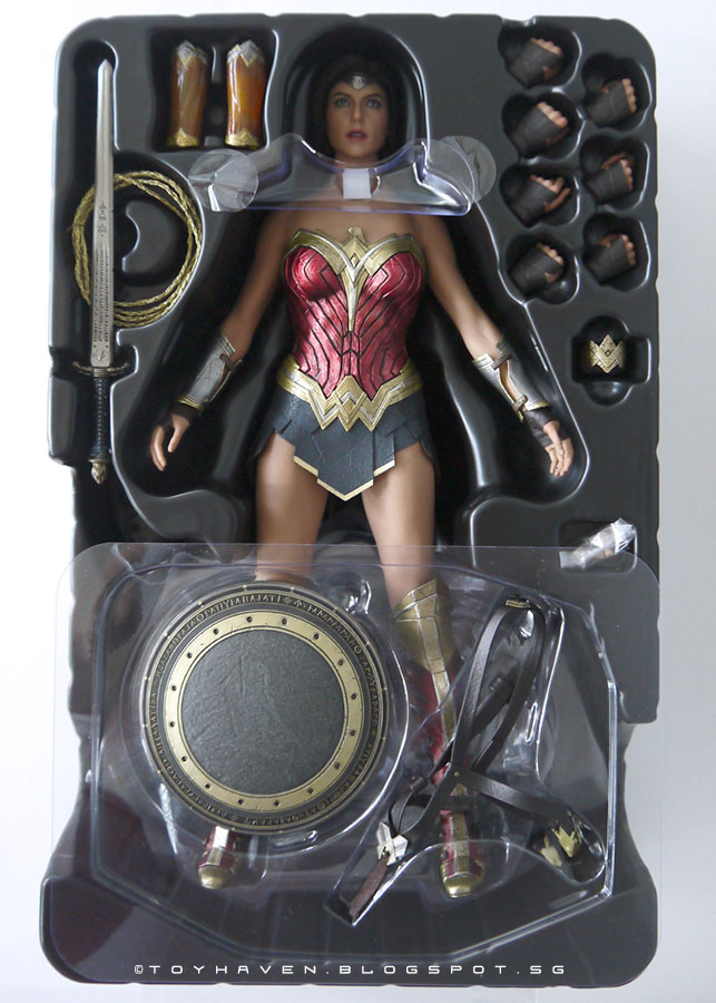 Accessories include the specially-designed Batman v Superman: Dawn of Justice themed figure stand with Wonder Woman nameplate and the movie logo, alternative pair of bracelets which is interchangeable with the ones she comes with, and extra left and right hands for posing as well as for holding her sword, shield and lasso.
