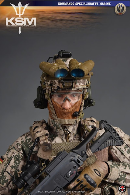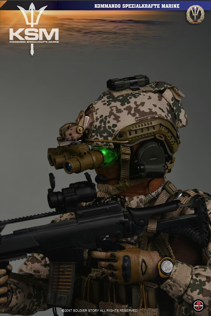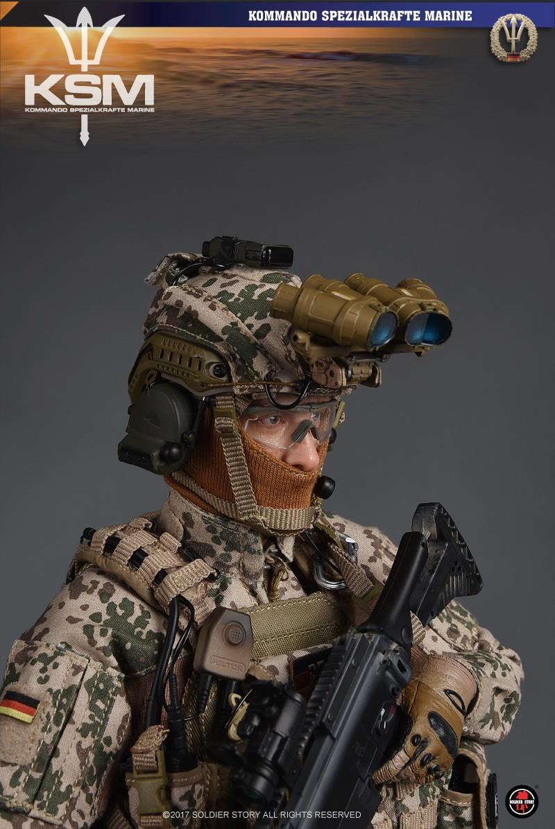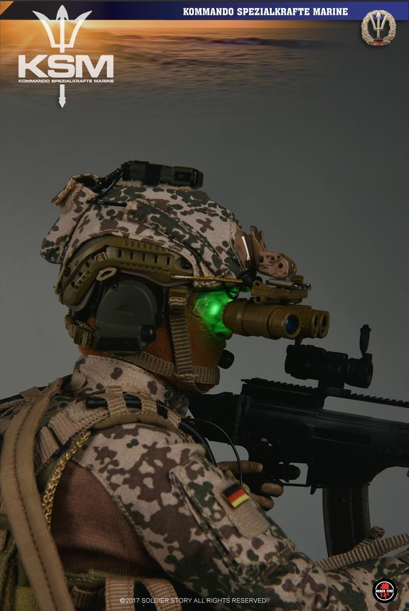 Soldier Story 1/6th scale Kommando Spezialkräfte Marine VBSS(KSM -VBSS) with New Feature: LIGHT-UP GPNVG-18! HEADSCULPT - Modern German kommando life-like head sculpt, S2.5 BODY, Bare Hand (1 Pair), Bare Feet (1 Pair) | HEADGEAR - Ops core fast ballistic helmet, Ops core fast helmet strap system, German desert flecktarn Ops core helmet cover /w NVG battery pack pouch, Ops Core NVG mount base, Wilcox GSGM ground spec goggle mount, GPNVG-18 ANVIS NVG, GPNVG-18 battery pack, GPNVG-18 green LED module (1 pair), GPNVG-18 protective cover (1 pair), MS-2000 strobe, Oakley SI ballistic M-frame, Flame resistant hood (orange-brown color) | UNIFORM - Lindnerhof desert flecktarn underway combat shirt, Lindnerhof desert flecktarn underway combat pants, Lindnerhof combat knee pad (1 pair), Brown T-shirt, Meindl Glockner MFS boot (1 pair , sewing)