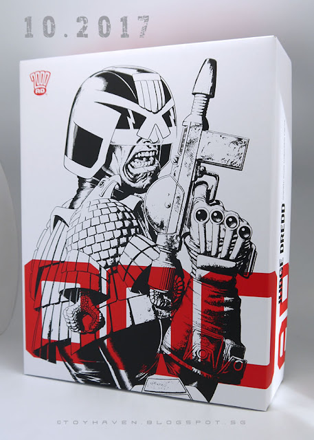 I quite like the 2000 AD x ThreeA 1/6th Scale JUDGE DREDD Collectible Figure box design, very faithful to the comic magazine with drawings of Dredd splashed on the front and back. There's also an extra band that keeps the box closed. The black band has the words JUDGE DREDD in red on the front and Justice Dept on the back. It also has line drawings of the weapons included under the header ARMORY.