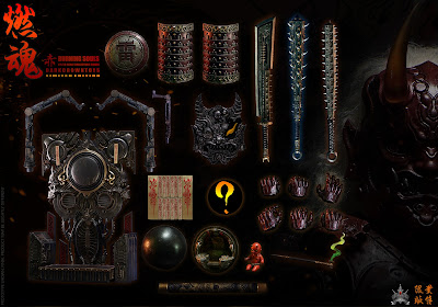 Other accessories include a right forearm armor that could summon lightning (interchangeable with the original designed armor), “Demon Bomb” with a mini-Red Oni in the traditional look of tiger skin cloth sitting in it, controlling the weapon of mass destruction and aid “Crimson” in battle. Kevin has also specially designed a “Soul-Pipe” for the character, which comes with special smoke effect parts to breathe life into the character.