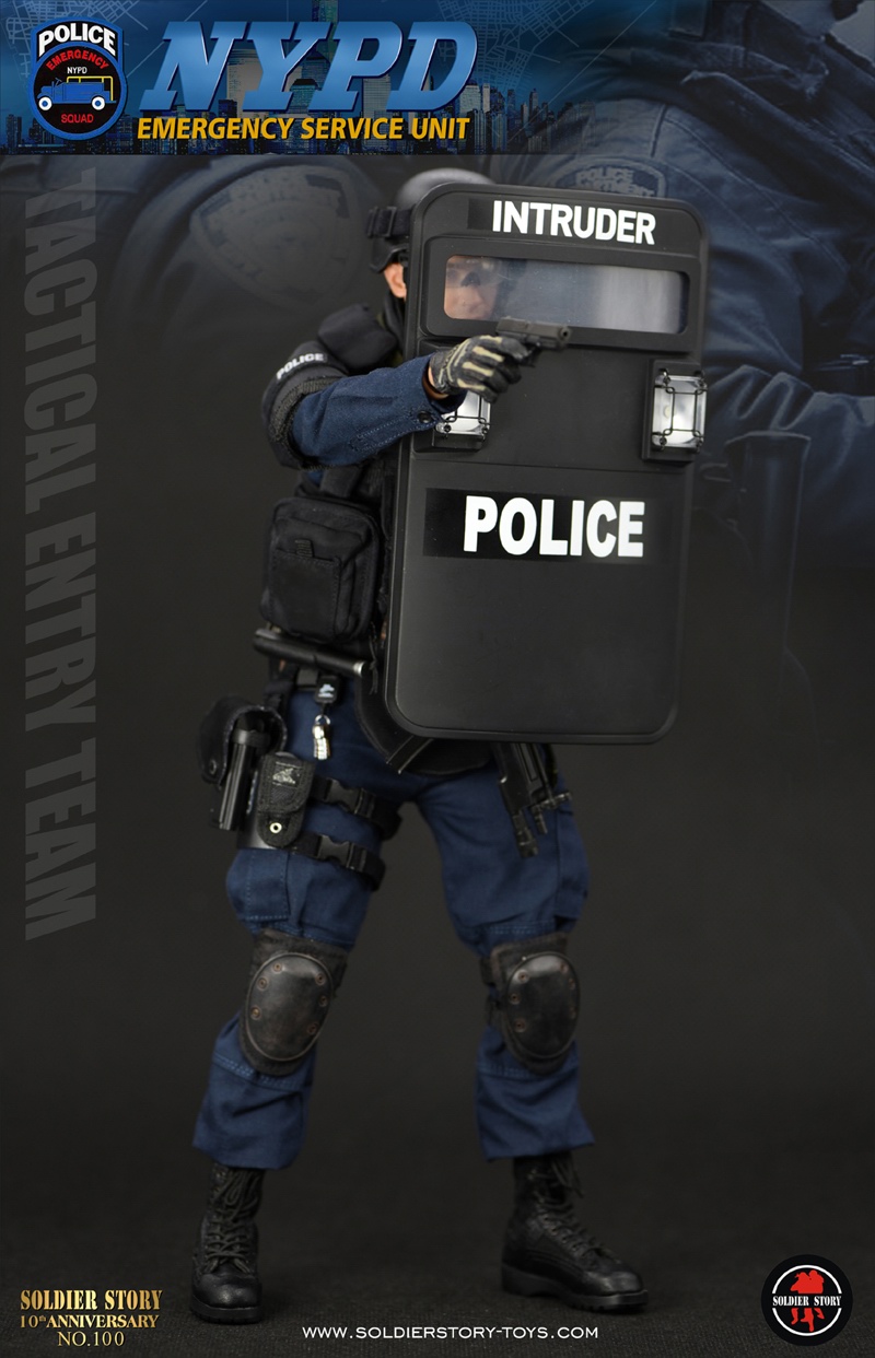 Soldier Story #SS100 1/6th scale NYPD ESU “TACTICAL ENTRY TEAM” 12-inch figure will come with HEADSCULPT: Modern NYPD officer life-like head sculpt (with a strong resemblance to Jake Gyllenhaal). HEADGEAR: MICH 2000 Helmet (with US Flag printed at the back), ACH 4-point chin straps, ESS tactical goggles, ESS ballistic glasses (clear version), Black balaclava, NYPD ESU officer cap. BODY: S2.5 BODY, Bare Hand (1 Pair), Bare Feet (1 Pair). UNIFORM: ESU tactical shirt (long sleeve with NYPD ESU patches), ESU logo blue T-shirt, ESU tactical pants, Inner short pants, Danner tactical boots (sewing / nylon & leather version)