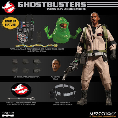Mezco Toyz One:12 Collective 1/12th scale Ghostbusters Figures feature: Approximately 17cm tall One:12 Collective body with over 28 points of articulation: Peter Venkman ~16.6cm, Ray Stantz ~16.7cm, Egon Spengler ~16.9cm, Winston Zeddemore ~16.6cm | Two (2) head portraits: Natural expression head and Scared expression head | Hand painted authentic detailing | Six (6) interchangeable hands: pair of fists, pair of posing hands,pair of proton gun holding hands