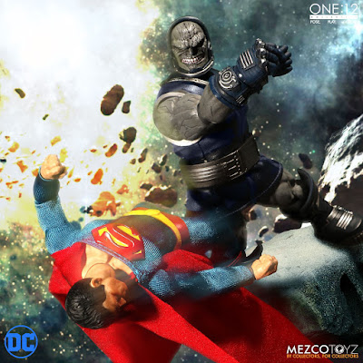 Mezco Toys One:12 Collective Darkseid figure features: One (1) Light-Up helmet with four (4) magnetically interchangeable faceplates (removable), Approximately 19 cm tall One:12 Collective body with over 28 points of articulation, Hand painted authentic detailing, Six (6) interchangeable hands: pair of fists, pair of Mother Box holding hands, pair of posing hands