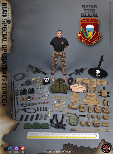 SoldierStory SS107 1/6th scale Iraq Special Operations Forces “ISOF” - SAW GUNNER action figure features: HEAD SCULPT - Modern ISOF life-like head sculpt | HEADGEAR - Ghost balaclava, I.S.O.F. exclusive baseball cap, Sand/black Arab shemagh head scarf | BODY - S2.5 body, Bare weapon hand (1 Pair), Bare feet (1 Pair) | UNIFORM - ISOF camo combat shirt, ISOF black T-shirt, ISOF camo combat pants, Tactical softshell jacket (skull print back), Inner vest, Merrell hiking boots (sewing / new color)