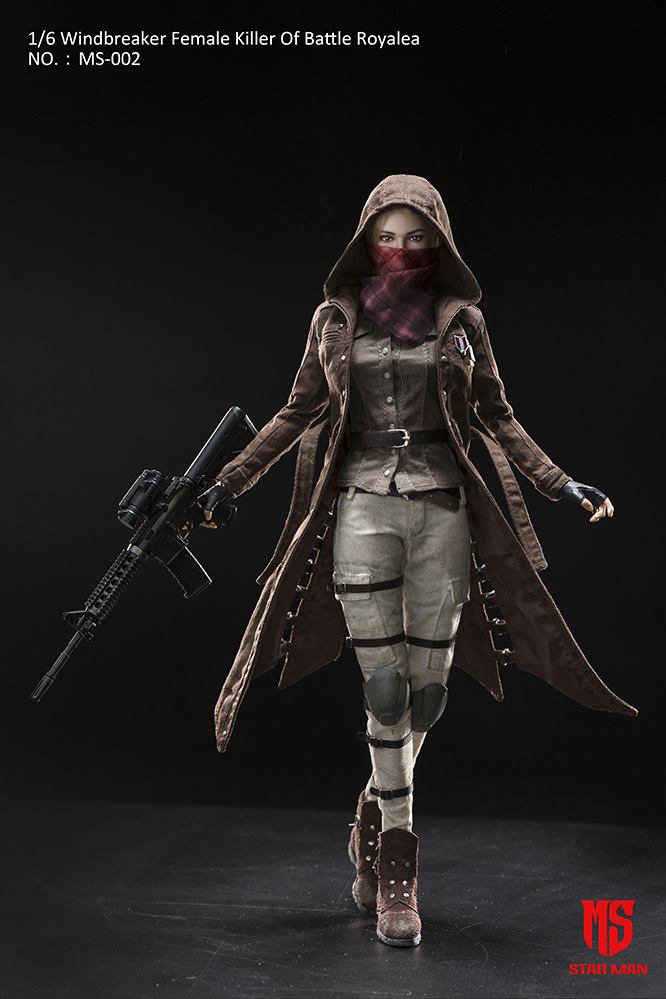 STAR MAN MS-002 1/6th scale Windbreaker Female Killer Of Battle Royale 12-inch Action Figure Parts List: head sculpt, Big chest female body (soft chest), Brown old windbreaker, light brown old blouses, creamy white old jeans, Brown old detachable boots, Scarf, Kneepads, Badge x3, Genuine leather belt x2, Leg leather belt x6, M416 assault rifle, M416 assault rifle magazine, M416 assault rifle sight, Hands with gloves in natural gesture x2, Hands with gloves for holding gun x2
