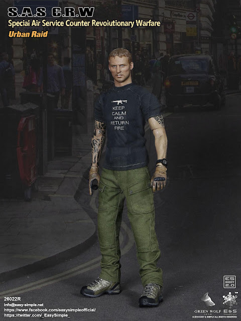 Easy & Simple 1/6th Scale S.A.S Counter Revolutionary Warfare (Urban Raid) Action Figure features: Printed Shirt, Tactical Pants, Inner Duty Belt, Plate Carrier, Plate Carrier Radio Pouch Set, 330D Hydration Pouch, Medium Utility Pouch, Single Frag Grenade Pouch, Gen 3 Fast Mag Pistol Pouch, Smoke Grenade Pouch, Flashbang Pouch, Roll up Dump Rouch, Molle Combat Belt, L129A2 5.56mm Assault Rifle with ACOG TA01 Scope + LA5 PEQ Indicator + M600 Tactical Light + SF Flash Hider + SF Suppressor + Angled Fore Grip + Steal Magazine + Emag Magazine + Tactical Sling, Glock17 9mm Pistol, Pistol Mag Cap, XTS RTI Holster, RTI Rotating Belt Mount, Special Purpose Backpack, FAST Ballistic Maritime Cut Helmet, NVG Shroud, L4G24 NVG Mount, AN/PVS-15 Night Vision Goggle, NVG Amber Filter, Helmet Light, NVG Counter Weight Pouch, Tactical Protective Mask, Kailash Boots, SI Pilot Gloves, PRC-152 Radio + Folding Antenna + Comtac 3 Headset with ACR Adaptor + Selex CT5 PTT, Carabineers, Foretrex 401 GPS, Hel-Star Strobe, M-84 Stunt Grenade, M-132A1 Smoke Grenade, M-109 Frag Grenade, G Watch, Combat Knife, Light Sticks, Tactical Scissors, Patches