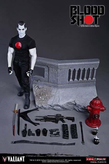 TBLeague (formerly Phicen Ltd) PL2018-119 1/6th scale Bloodshot 12-inch Action Figure features: head sculpt, TB League male seamless body with metal skeleton, 2 pairs x interchangeable hands, T-shirt, pants, boots, belt, 2 x cartridge belts, samurai sword, sheath for sword with carrying strap, 3 x handguns with holsters, strap for holding 1 handgun to the thigh, combined gun, fire hydrant, base