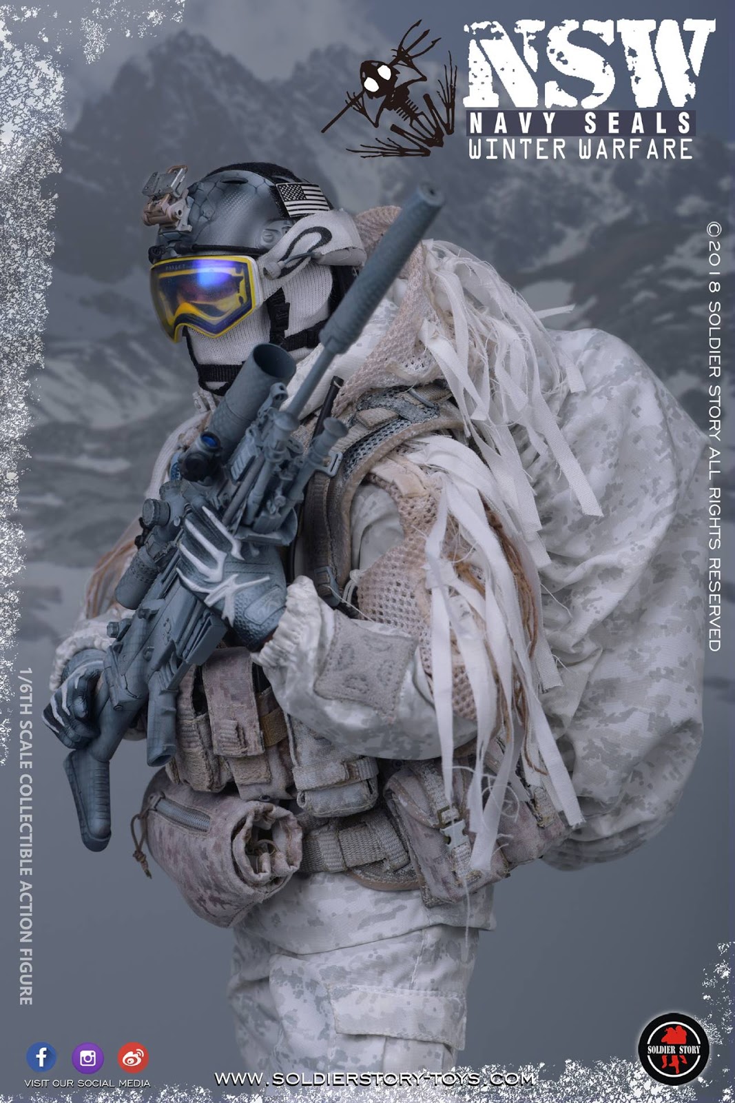 Soldier Story 1/6th scale NSW (Naval Special Warfare) Winter Warfare “Marksman” 12-inch figure features - HEADGEAR: Winter balaclava, Oakley canopy snow goggles, Opscore blk carbon helemt (snow camo spray), S&S Precision V-Lite (red), Princeton Tec charge MPLS helmet light, AN/PVS 15 NVG, NVG compass, Wilcox L4G24 NVG mount. HEAD SCULPT: Modern Navy SEAL life-like head sculpt. BODY: S2.5 body, Bare weapon hand (1 Pair), Bare feet (1 Pair). UNIFORM: Halys PCU L7 jacket type 1, Halys PCU L7 pants type 1, VertxOverwhite suit, VertxOverwhite trousers, Brown T-shirt, Inner white pants, Asolo hiking boots (sewing/grey). TAC GEAR: Tactical concealment viper hood (snow camo spray), Moss dreadlocks, Snow camo fabric straps, NSW contract swimmer cut less than overt carrier (frog skull printed), EI AOR1 MPCR muti-purpose molle chest rig (snow camo spray), EI AOR1 radio pouch (snow camo spray), EI AOR1 kydex insert 5.56/9mm magazine pouch (snow camo spray), EI AOR1 kydex insert 5.56 magazine pouch (snow camo spray), EI AOR1 winter hand warmer sleeve pouch (snow camo spray), EI AOR1 M14/SR25 7.62 magazine pouch (snow camo spray) x 2, LBT AOR1 M4 magazine pouch (snow camo spray) x 2, LBT AOR1 9mm magazine pouch custom knife sheath (snow camo spray), LBT AOR1 NVG pouch (snow camo spray), AOR1 medic utility pouch (snow camo spray), Eberlestock rifle backpack (snow camo spray), Eberlestock scope cover & crown protector (snow camo spray), Digital snow camo backpack cover, OR AOR1 water bottle pouch (snow camo spray), OR Hiking gaiter (1 pair), Hydration tube /w snow fabric cover, Hydration pouch (plastic), Swimmer armor plate x 2, EMT Scissors (yellow), Carabiner, Tourniquet rubber band, Velket tourniquet, Yellow light stick (short) x 4, SOG SEAL pup tactical knife, Snow walking traction cleats (1 pair), Mechanix snow camo gloved weapon hand (1 pair), Cigar