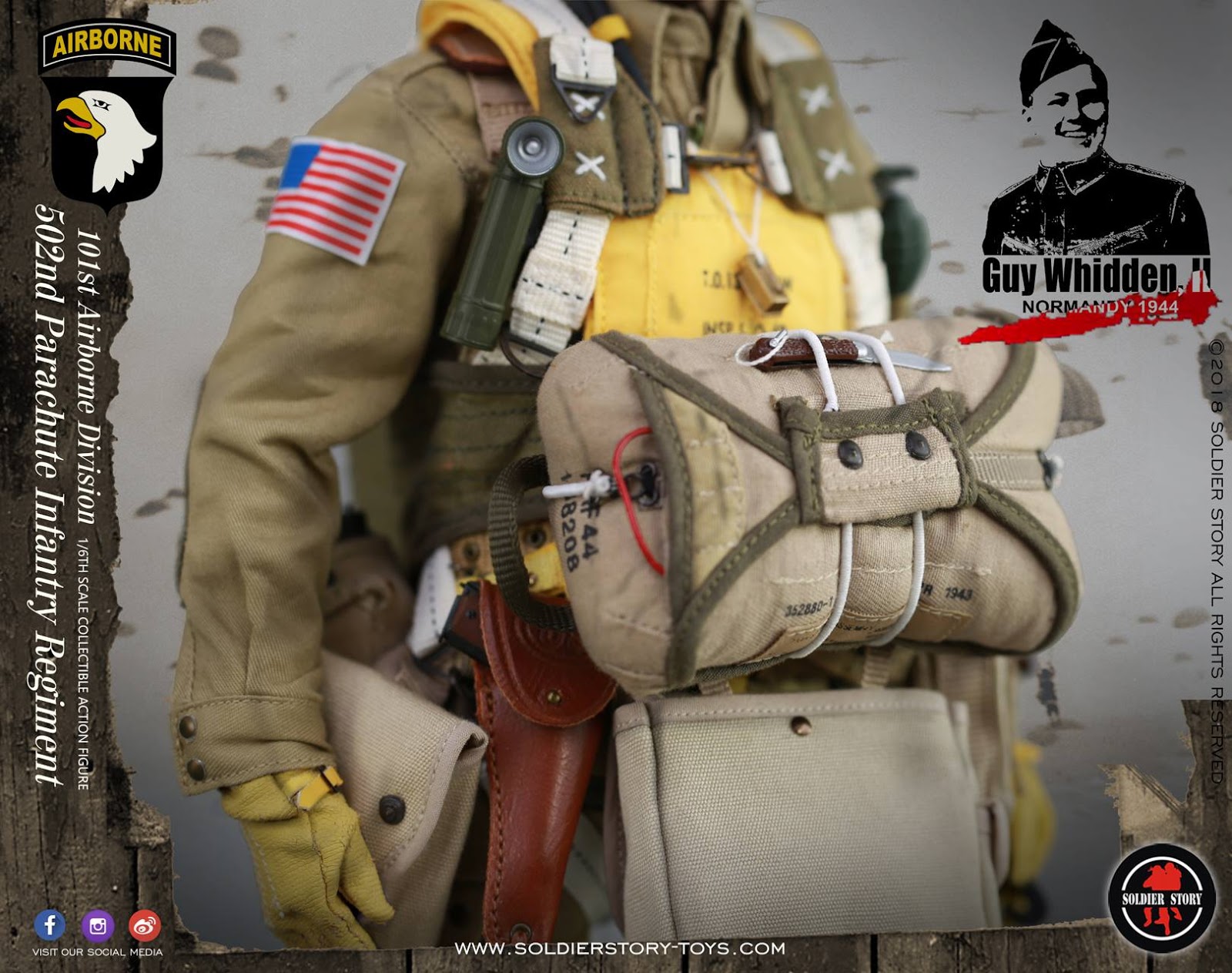 Soldier Story #SS110 1/6th scale WWII 101ST AIRBORNE DIVISION “GUY WHIDDEN, II” 12-inch action figure features: HEADSCULPT: WWII "Guy Whidden, II" life-like head sculpt BODY: S2.5 BODY, Weapon bare Hands, Bendable bare Hands, Bare Feet HEADGEAR: M-1C paratrooper helmet (metal), M-1C helmet net cover, US airborne garrison cap, M5-11-7 assault gas mask, Gas mask filter, M-1944 dust goggles (clear lens), M-1944 dust goggles (dark polarizing lens) UNIFORM: GI wool shirt, M-1942 parachutist jacket, M-1942 parachutist pants, Corcoran jump boots (sewing leather) FIELD GEAR: M-1936 suspenders, Shoulder pads, M-1938 riding gloves, M-1936 pistol belt, M-1910 canteen cover, M-1910 canteen (metal), M-1910 canteen cup (metal), M-1942 first aid pouch, M-1910 entrenching tool cover, M-1910 E tool entrenching tool shovel (metal), M-1936 musette jump bag, Paratrooper rigger universal ammo pouch, TL-122 flashlight torch, M-1918 combat knife, M-1918 knife sheath, M-2 folding knife, M-2 grenade, M-1 ammunition carrying /w carrying strap, Paratrooper wrist compass (1944), Model A-11 US military watch, Paratrooper cricket, MKII No75 “Hawkins Mine” (/w leg strap), M-7 black rubberized gas mask bag, B-4 life vest (1943 dated), Airborne let down rope, T-5 parachute main pack (/w harness), T-5 reserve chest pack, Paratrooper leg bag