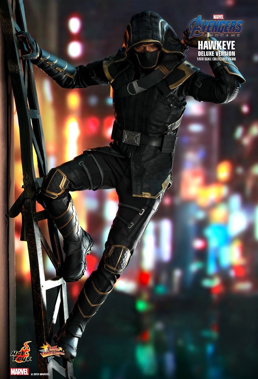 Hot Toys MMS532 Avengers: Endgame 1/6th scale Clint Barton/Hawkeye/Ronin Collectible Figure (Deluxe Version) specially features: newly developed head sculpt with authentic and detailed likeness of Jeremy Renner as Hawkeye from Avengers: Endgame | newly developed masked head sculpt with authentic and detailed likeness of Ronin*** | Movie-accurate facial features with detailed wrinkles and skin texture | Approximately 30 cm tall Body with over 30 points of articulations | Six (6) pieces of interchangeable hands for Hawkeye including: pair of fists, pair of open hands, right hand for holding bow, left hand for holding arrow, Six (6) pieces of black-colored interchangeable gloved hands for Ronin including***: pair of fists***, pair of open hands***, pair of hands for holding dagger***