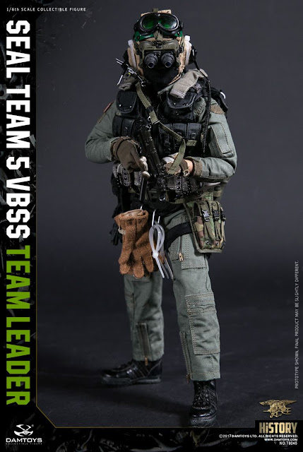 Dam Toys (Dam#78046) 1/6th scale Seal Team 5 VBSS Team Commander Parts list: Head sculpt, Dam Action Body, Hand Palms For Gloves, Nomex Gloves, Seal Custom Flight Deck Helmet With Radio Headset, Sun Wind Dust Goggles, Nomex Face Mask, CWU-27/P Nomex Flight Suit, Flag Patch, LPU-28 Life Preserver, Spie Rig Harness Hookup, TPLE Body Armor, ABA Tactical Vest, ABA Triple Mp5 Mag Pouch A, ABA Triple Mp5 Mag Pouch B, ABA GP Pouch X2, ABA Back Pack, ABA Drop Leg Holster, ABA Double Pistol Mag Pouch, Drop Leg Double Mag Pouch, Maskbag, LC2 Belt, Custom LC2 Ammo Pouch, LC2 1-Quart Canteen Pouch, SDU-5/E Strobe Light With Pouch, ABA Blet Pouch, M9 Bayonet, Mk13mod0 Signal, Light Stick, Knee Pads, Seal Coral Boots, Rappelling Gloves, Carabiner X2, LST-5 UHF Radio, KY-57 Voice Encryption Unit, H250U Handset, MX 300-R Radio, MP5N SMG With Flash Light, MP5 Mag X3, MP5 3 Point Sling, P226 Pistol, Pistol Mag X2, M18 Smoke Grenade, M7A2 Tear Gas Grenade, Restraints Plastic Cuffs X4