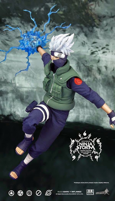 InFlames / R.E.D. Mark 1/6 scale Ninja Storm Version 2.0 figure set specially features: Elaborately sculpted heads x 2, Approximately 30 cm tall FB02 type body, Interchangeable hands x 8, false gloves (to pose the gesture of hand in pockets) x 2, Dark blue long-sleeved top, Green tactical vest, Dark blue pants, white leg wrappings x 2, Tactical packet x 2, Ninja Dagger x 2, One pair of ninja boots, Lightning effects, Kakashi Hatake's favorite book, Square stage with transparent pillar figure stand.