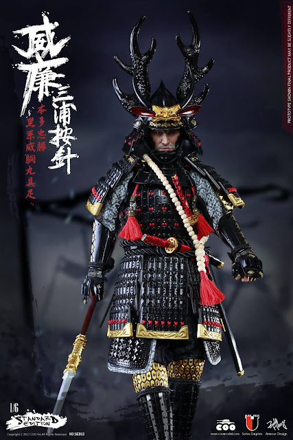CooModel SE016 1/6th scale Series of Empires William Adams AKA Miura Anjin Collectible Figure is inspired on the legendary WHITE SAMURAI, WILLIAM ADAMS, A.K.A MIURA ANJIN. They have combined this character with HONDA TADAKATSU’s famous black gusoku, to show an armored heroic posture. The gusoku is about 60% made of alloy and the armor pieces are folded by knots. Some spear and blade parts are made of alloy. The stand is made of solid wood