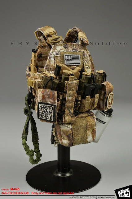 This will be MC TOYS upcoming release: M-045 1/6 scale ERYX Soldier outfit and gear set which will comprise: Boonie hat, Combat shirt, Combat pants, Belt, Zephyr GTX Mid TF hiking boots, Sunglasses, D3 chest rig+zip pouch, Plate carrier, Waist gun holster, HK45 Pistol, Pistol magazine x 2, SEAL PUP M37K knife, CBK Concealed backup knife, Machete, Machete sheath, 1000ml wide mouth bottle, Backpack, Patches x 3, Magazine dump drop pouch, D ring, Collars, Safety lanyard, HK416 assault rifle with 552 Holographic weapon sight, CTR Stock, Angled Fore-Grip, Gun light, PEQ15, rifle sling. Also comes with 416 Magazine x 4