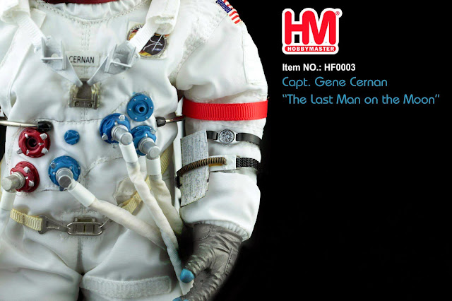 Hobby Master Toys has painstakingly recreated a 1:6 scale Captain Gene Cernan 12-inch figure in his EVA space suit, complete with moon boots and capsule boots. The figure features: Character Head (1/6 scale head sculpt) and 12-inch Action Figure Body, A7-LB suit, LEVA, Pressure Helmet, Communication Carrier, Oxygen Purge System, EV Glove, PLSS RCU, Moonwatch, Notepad, Apollo Lunar Hasselblad camera, Apollo Hammer, Badges.